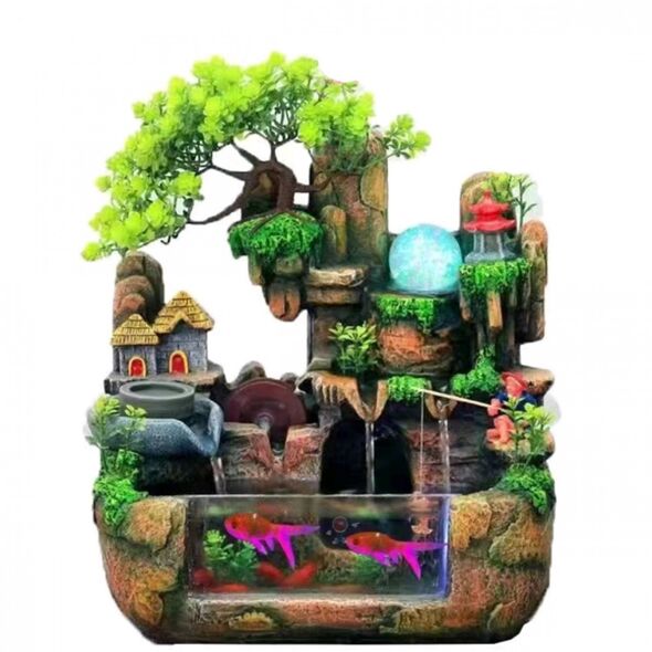 Διακοσμητικό Συντριβάνι Feng Shui με Σπιτάκι, Δέντρο, Λίμνη, Τρεχούμενο Νερό & Πολύχρωμο Φωτισμό LED 30x20x30 εκ