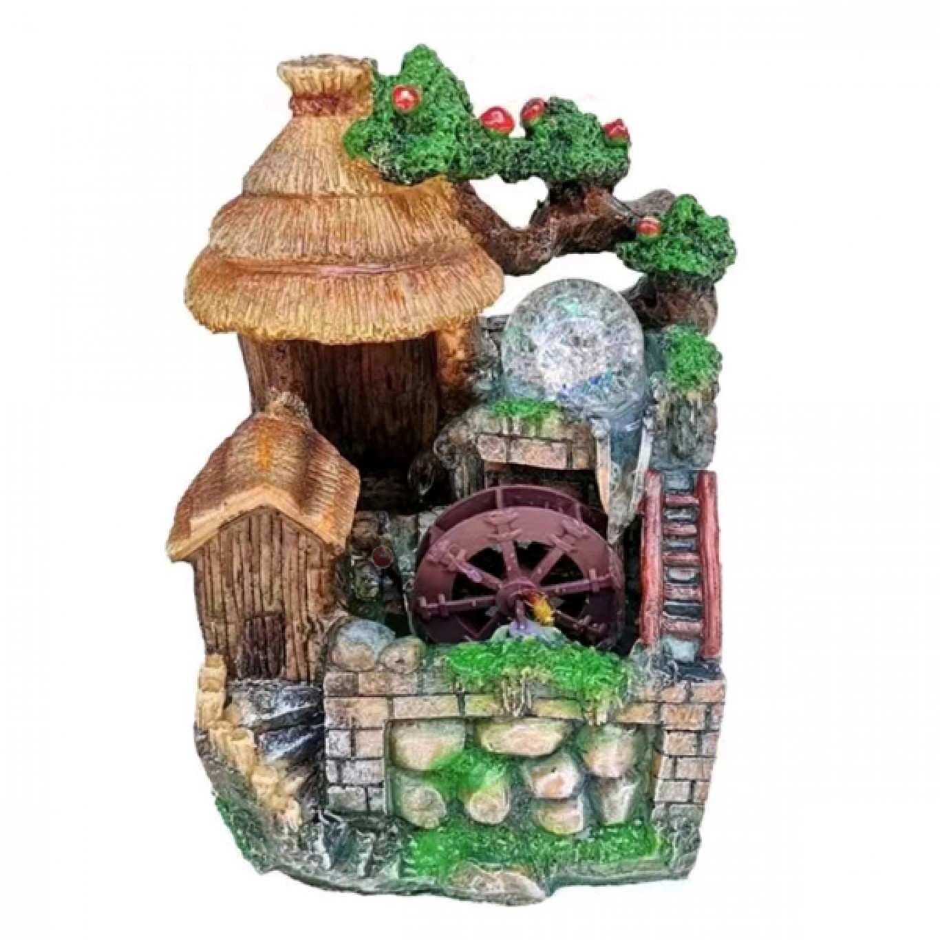 Το νερό ρέει και περιστρέφει τον νερόμυλο και την κρυστάλλινη φωτιζόμενη μπάλα ενώ ο πολύχρωμος φωτισμός Led συμβάλλει στην δημιουργία ενός μοναδικού εφέ χρωμάτων.