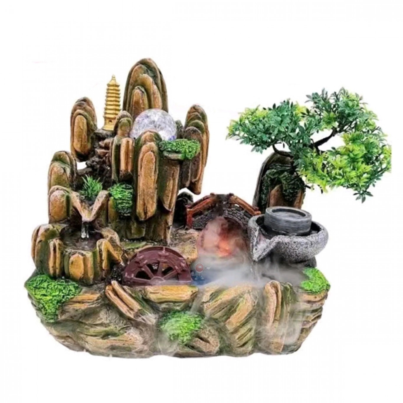 Διακοσμητικό Συντριβάνι Feng Shui με Σπιτάκι, Δέντρο, Τρεχούμενο Νερό & Πολύχρωμο Φωτισμό LED 30x20x30 εκ