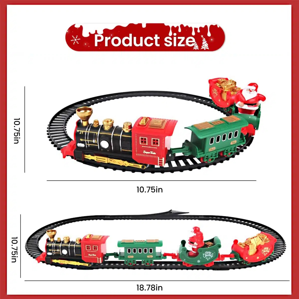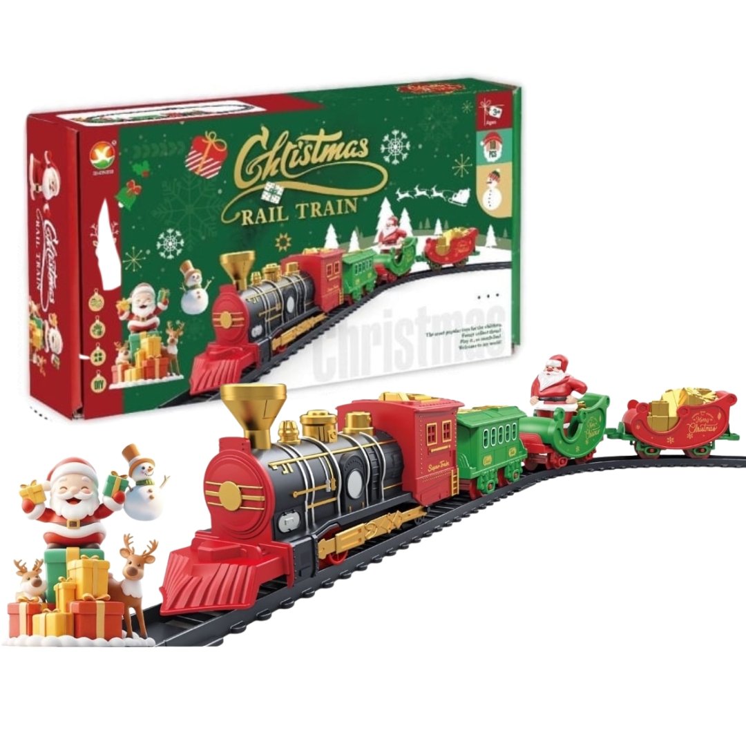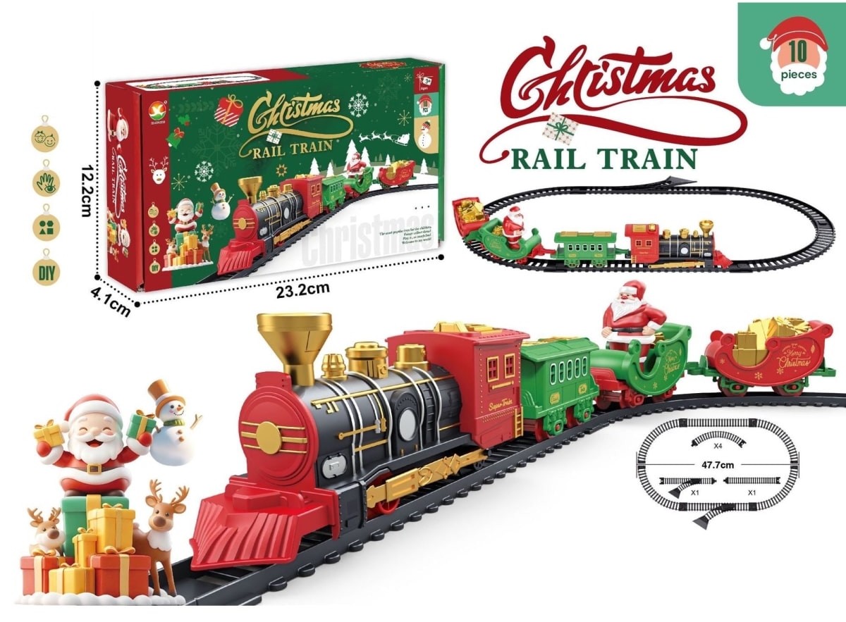 - Περιλαμβάνει: Ατμομηχανή, βαγόνι Άγιου Βασίλη, επιβατικό βαγόνι, βαγόνι με χριστουγεννιάτικο δέντρο, ράγες