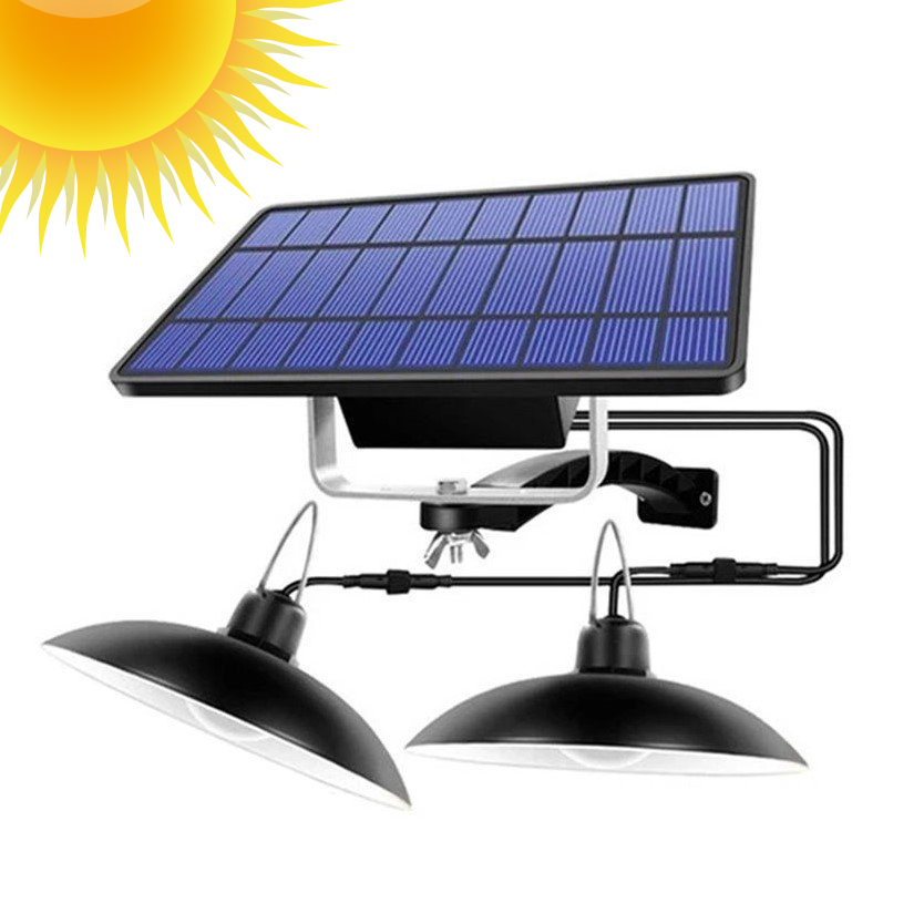 Διπλό ηλιακό φωτιστικό σε μαύρο χρώμα, που συγκεντρώνει και αποθηκεύει ηλιακή ενέργεια για τη λειτουργία του, ώστε να μη χρειάζεται να συνδεθεί σε παροχή ρεύματος.