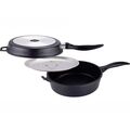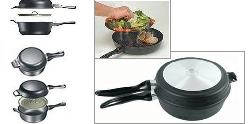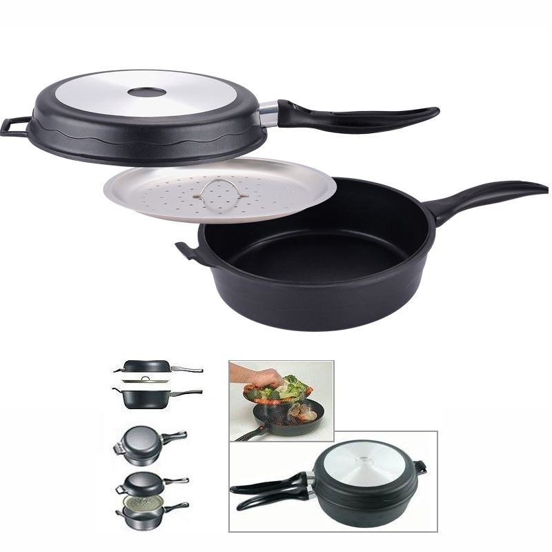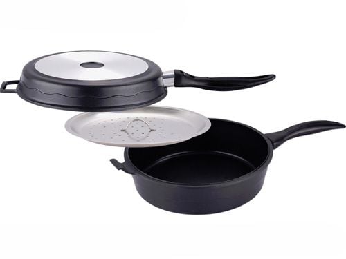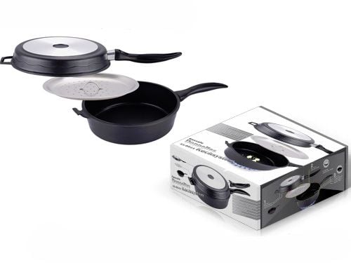 Διπλό Τηγάνι Double Frying Pan από αλουμίνιο, που διαθέτει σκεύος ατμού που τοποθετείται ενδιάμεσα και μπορείτε να ετοιμάσετε δύο διαφορετικά πιάτα ταυτόχρονα, λόγω ύψους μπορείτε να ψήσετε ένα ολόκληρο κοτόπουλο ή να τα χρησιμοποιήσετε σαν δύο ξεχωριστά τηγάνια.