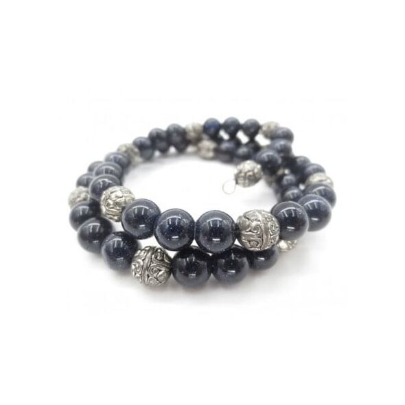 Υπέροχο ενεργειακό βραχιόλι με δύο σειρές με σφαιρίδια μπλε χρυσόλιθου (blue sandstone) και μεταλλικά στοιχεία, που προσαρμόζεται σε όλα τα μεγέθη και χαρίζει στον κάτοχό του τις μοναδικές ιδιότητες του λίθου.