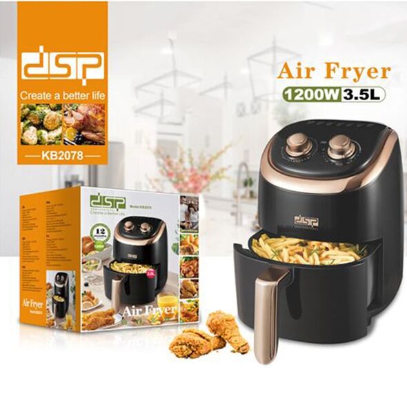 Η ισχυρή φριτέζα αέρος της DSP® με ισχύ 1200W και κάδο χωρητικότητας 3.5 λίτρων, είναι μια ιδανική λύση για να μαγειρεύετε πιο υγιεινά και οικονομικά σε σχέση με τις κλασικές φριτέζες, καθώς χρησιμοποιεί ελάχιστο λάδι (1-2 κουταλιές).