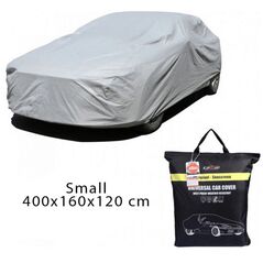 Universal υφασμάτινη κουκούλα αυτοκινήτου Small 400×160×120 cm, με αδιάβροχο ύφασμα και φιλμ αλουμινίου. Προστατεύει από ήλιο, βροχή και σκόνη, διαθέτει ιμάντες στερέωσης και συνοδεύεται από θήκη αποθήκευσης.