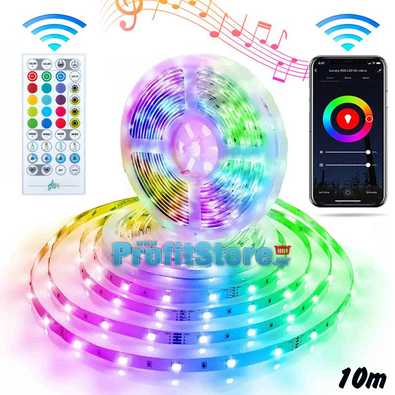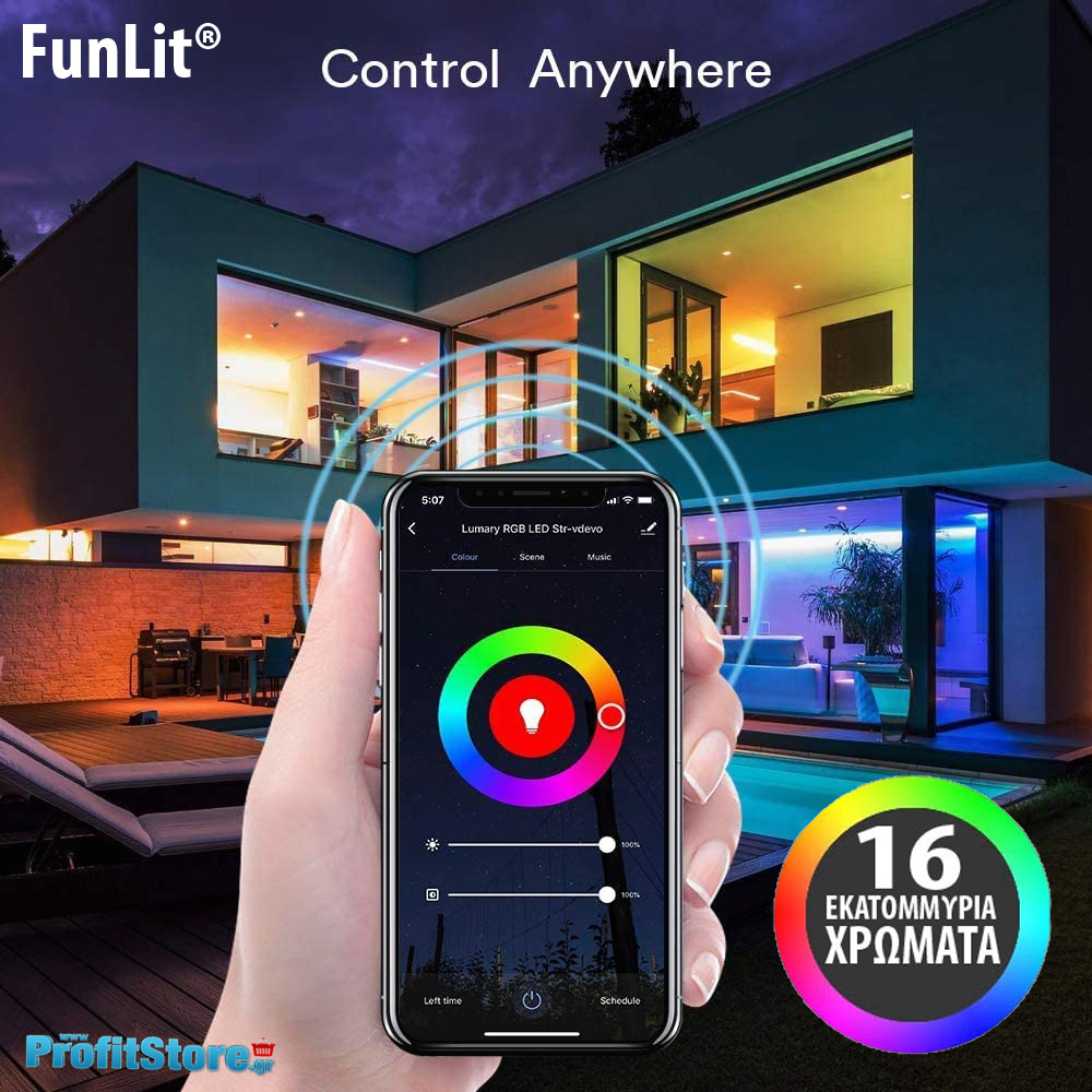 Έξυπνη Ταινία LED 10m (2x5m) Wifi με App Κινητού FunLit® RGB Φωτορυθμικό SMD5050 USB 30LED/2.4W/m 2.4GHz & Ασύρματο Χειριστήριο - Αυτοκόλλητος Ατμοσφαιρικός Φωτισμός Εσωτερικού Χώρου