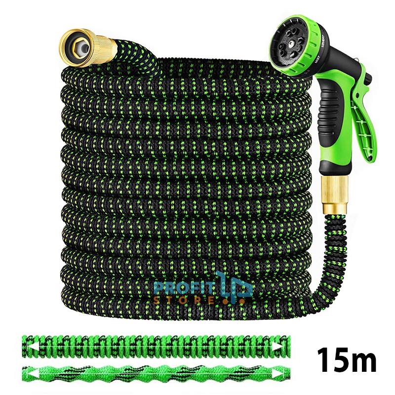 Έξυπνο Ενισχυμένο Επεκτεινόμενο Λάστιχο Κήπου & Βεράντας 15m με 7 σε 1 Πιστόλι & Μεταλλικό Ρακόρ - Πράσινο - Μαύρο