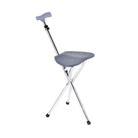 Μπαστούνι στήριξης με αναδιπλούμενο σκαμπό. Το μπαστούνι έχει 3 ποδαράκια με λαστιχένιο πώμα που παρέχουν σταθερότητα, αντιολισθητικές λαβές από μαλακό σφουγγάρι και αναδιπλούμενο σκαμπό. Το σκαμπό είναι πλαστικό, ανοίγει εύκολα αλλά σταθερά και σας ξεκουράζει σε περίπτωση πολύωρης ορθοστασίας. Εάν θέλετε να ξεκουραστείτε ενώ περπατάτε, ξεδιπλώστε το κάθισμα στο μπαστούνι και έχετε ένα τρίποδο κάθισμα. Όταν κάθεστε, η λαβή που προεξέχει πρέπει να είναι μπροστά σας. Αυτό σας επιτρέπει να κρατιέστε από κάπου ενώ κάθεστε. Επειδή το μπαστούνι είναι κατασκευασμένο από αλουμίνιο, είναι ελαφρύ, αλλά πολύ ανθεκτικό. Άνετο και εύκολο στην μεταφορά καθώς είναι ελαφρύ και πτυσσόμενο για να μην πιάνει μεγάλο όγκο. Ιδανικό δώρο για τον τον παππού και την γιαγιά, μπορούν να το χρησιμοποιήσουν στην εκκλησία, στις διακοπές, στον περίπατο, στην παραλία ή ακόμα και στις ατελείωτες ουρές των δημόσιων υπηρεσιών.