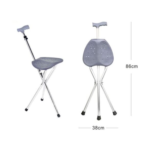 Μπαστούνι στήριξης με αναδιπλούμενο σκαμπό. Το μπαστούνι έχει 3 ποδαράκια με λαστιχένιο πώμα που παρέχουν σταθερότητα, αντιολισθητικές λαβές από μαλακό σφουγγάρι και αναδιπλούμενο σκαμπό. Το σκαμπό είναι πλαστικό, ανοίγει εύκολα αλλά σταθερά και σας ξεκουράζει σε περίπτωση πολύωρης ορθοστασίας. Εάν θέλετε να ξεκουραστείτε ενώ περπατάτε, ξεδιπλώστε το κάθισμα στο μπαστούνι και έχετε ένα τρίποδο κάθισμα. Όταν κάθεστε, η λαβή που προεξέχει πρέπει να είναι μπροστά σας. Αυτό σας επιτρέπει να κρατιέστε από κάπου ενώ κάθεστε. Επειδή το μπαστούνι είναι κατασκευασμένο από αλουμίνιο, είναι ελαφρύ, αλλά πολύ ανθεκτικό. Άνετο και εύκολο στην μεταφορά καθώς είναι ελαφρύ και πτυσσόμενο για να μην πιάνει μεγάλο όγκο. Ιδανικό δώρο για τον τον παππού και την γιαγιά, μπορούν να το χρησιμοποιήσουν στην εκκλησία, στις διακοπές, στον περίπατο, στην παραλία ή ακόμα και στις ατελείωτες ουρές των δημόσιων υπηρεσιών.