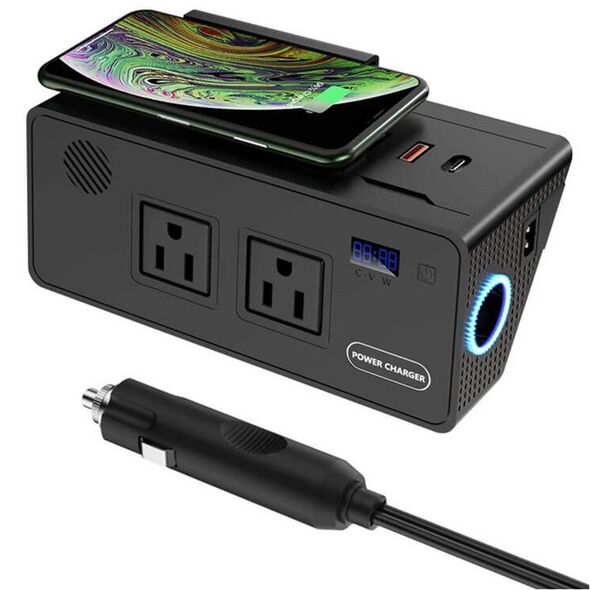Έξυπνο Inverter Ασύρματης Φόρτισης Κινητού - Μετασχηματιστής Αυτοκινήτου 12V-220V 400W, Fast Charge 10W με 2 Πρίζες, 2 Θύρες USB, 1 Θύρα Type C, Βάση Φόρτισης ANDOWL