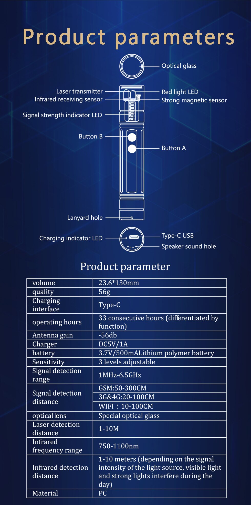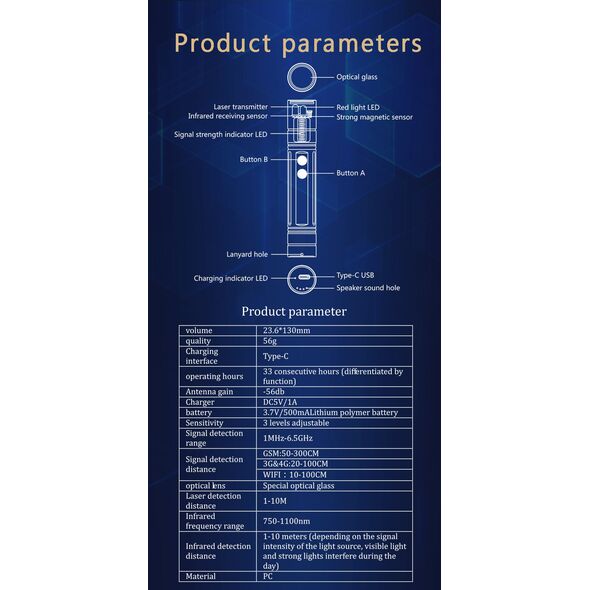 - Απόσταση ανίχνευσης: GSM 50-300cm, 3G&4G: 20-100CM, Wifi: 10-100cm, Laser: 1-10m,