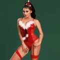 Το κόκκινο κορμάκι συνδυάζει παγιέτες, δαντέλα και απαλή λευκή γούνα, δημιουργώντας ένα look που θυμίζει πολυτελή Χριστουγεννιάτικη στολή.