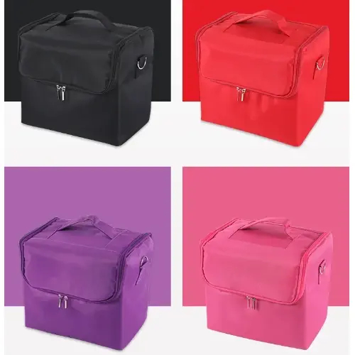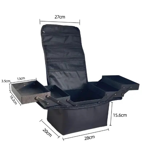 Επαγγελματική τσάντα καλλυντικών με αδιάβροχο ύφασμα, πολλαπλά διαμερίσματα, πλέγματα και ιμάντα ώμου. Ιδανική για makeup artists ή για οργανωμένη αποθήκευση εργαλείων ομορφιάς.