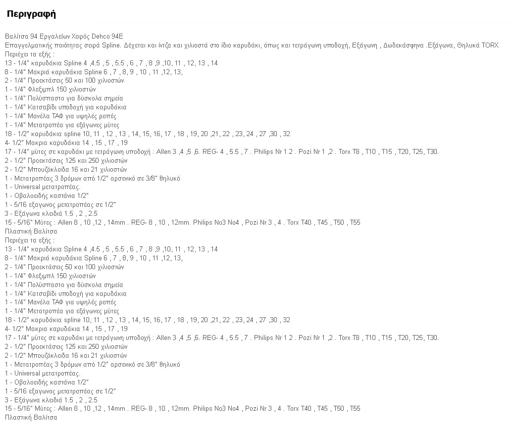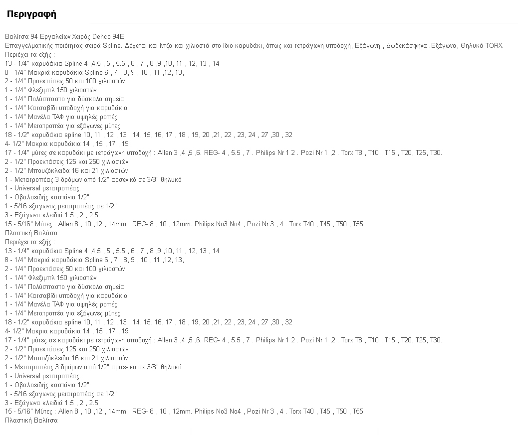 Με 94 εργαλεία ιδανική για κάθε μάστορα και ερασιτέχνη. Θα καλύψει τις περισσότερες ανάγκες σας με καστάνιες, προεκτάσεις, συνδέσμους, καρυδάκια, μύτες κατσαβιδιού άλλεν, Torx, Philips κλπ