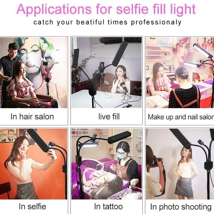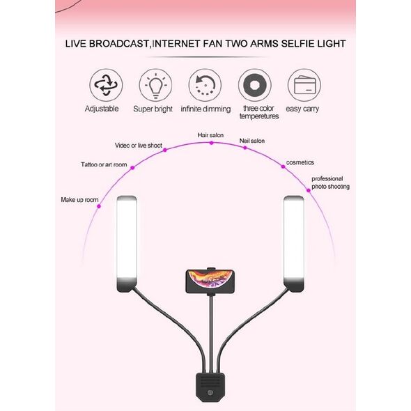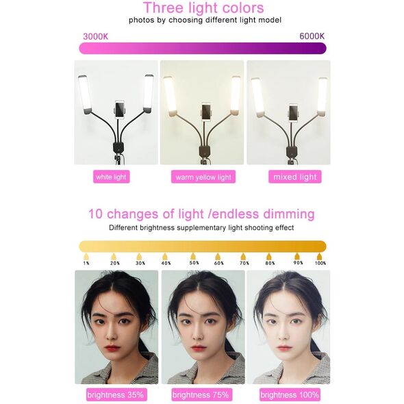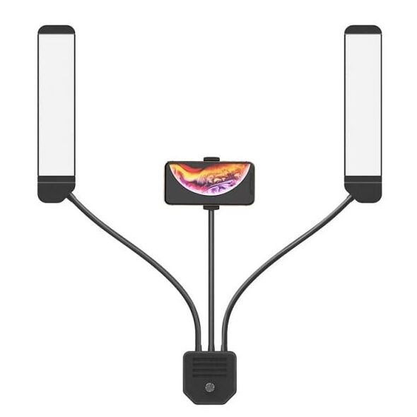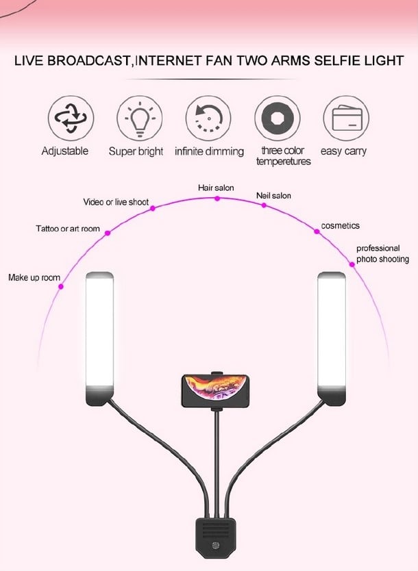 Πρωτοποριακό διπλό φωτιστικό LED 35W με βάση κινητού. Διαθέτει 3 ρυθμίσεις θερμοκρασίας φωτός και ρυθμιζόμενη φωτεινότητα. Ιδανικό για επαγγελματικού επιπέδου φωτογραφίες, βίντεο, live streaming ή ακόμα και σαν φωτιστικό σε μαγαζια περιποίησης όπως κομμωτήρια κλπ.