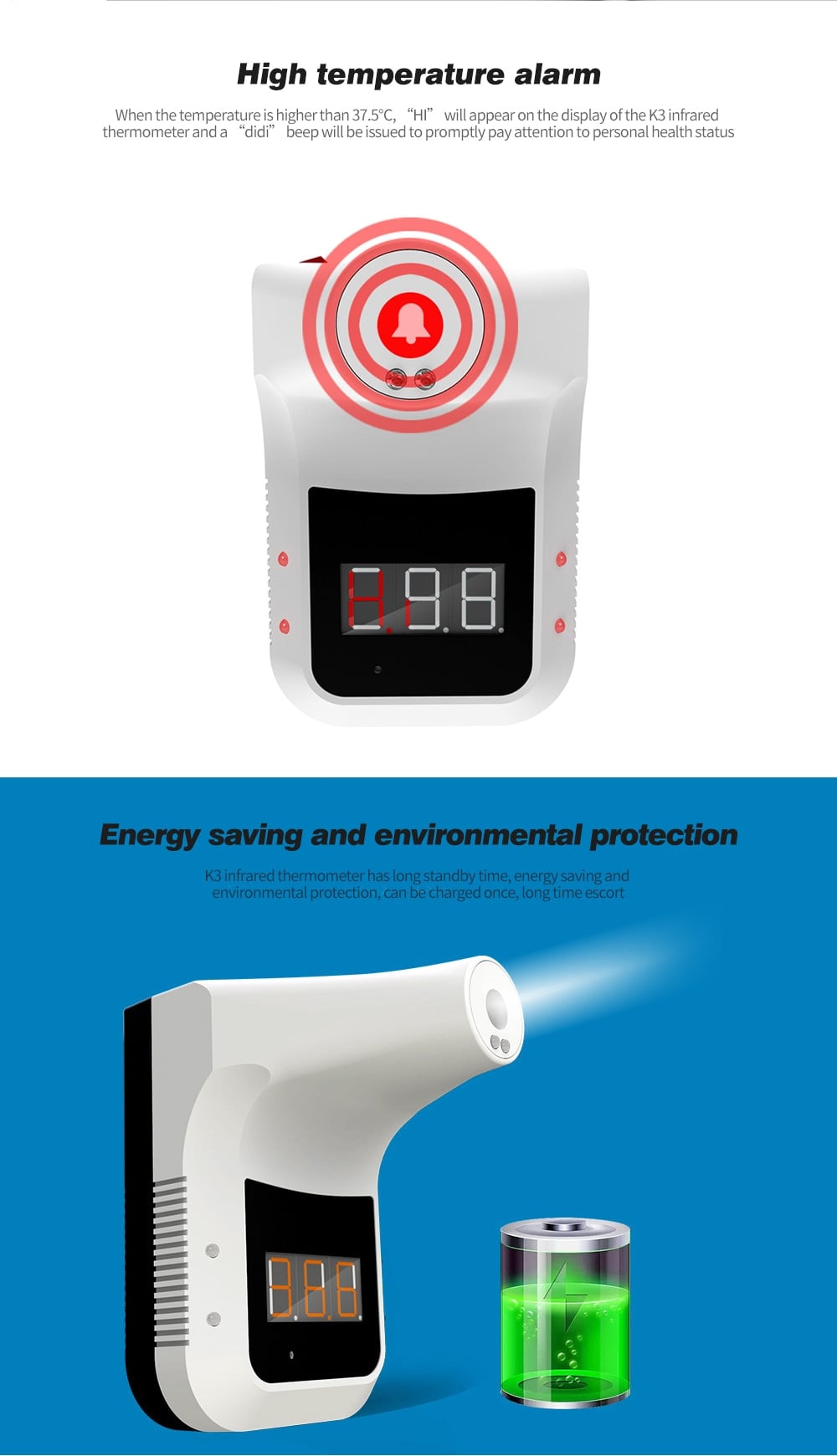 Όταν η θερμοκρασία είναι υψηλότερη από 37,5 ° C, στην οθόνη του υπέρυθρου θερμομέτρου K3 θα εμφανιστεί η ένδειξη "HI" και θα εκδοθεί ένα ηχητικό σήμα για άμεση προσοχή στην προσωπική κατάσταση της υγείας