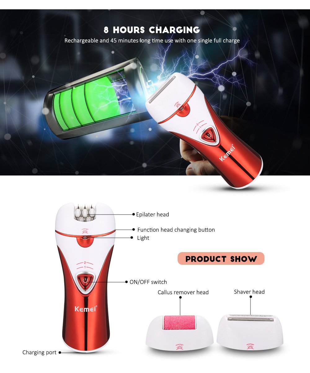 Επαναφορτιζόμενη Αποτριχωτική Μηχανή-Ξυριστική και Αφαίρεσης Κάλων Ποδιών 3 σε 1 KEMEI – KM-1107