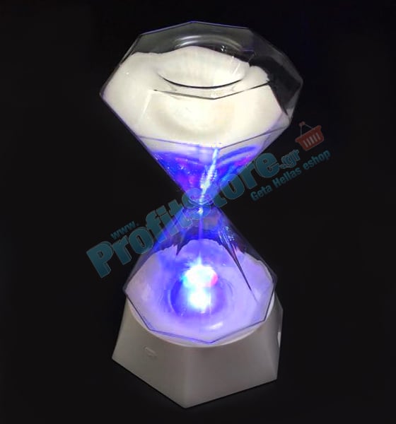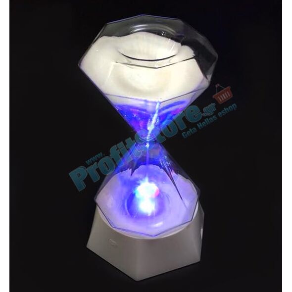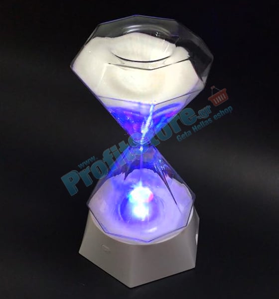 Πάντα μία κλεψύδρα έμοιαζε γοητευτική και ο καθένας μας θα μπορούσε να ασχολείται με αυτήν για ώρες! Με μοναδικό σχεδιασμό σχήματος διαμαντιού,τον ειδικό πολύχρωμο φωτισμό LED και την λευκή γυαλιστερή άμμο, η κλεψύδρα αυτή θα πάρει μοναδική θέση στη διακόσμηση του σπιτιού ή του γραφείου σας!