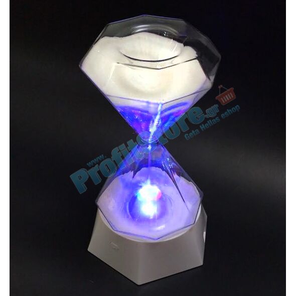 Πάντα μία κλεψύδρα έμοιαζε γοητευτική και ο καθένας μας θα μπορούσε να ασχολείται με αυτήν για ώρες! Με μοναδικό σχεδιασμό σχήματος διαμαντιού,τον ειδικό πολύχρωμο φωτισμό LED και την λευκή γυαλιστερή άμμο, η κλεψύδρα αυτή θα πάρει μοναδική θέση στη διακόσμηση του σπιτιού ή του γραφείου σας!
