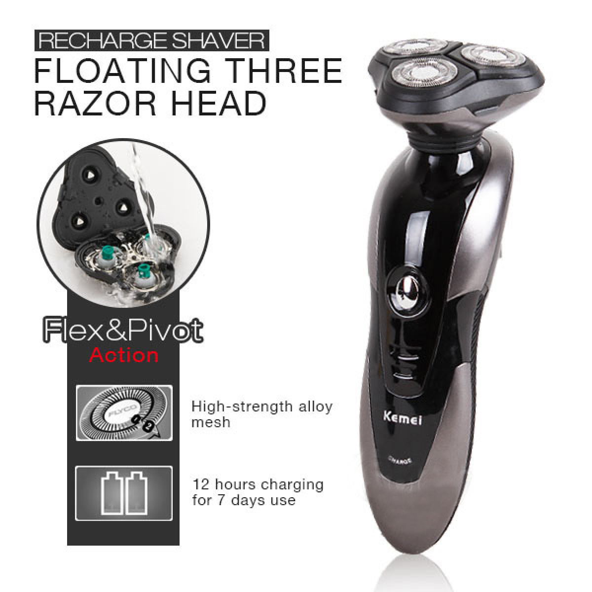 Επαναφορτιζόμενη Ξυριστική Μηχανή 3 Κεφαλών 3D Floating Kemei RSCX-9006