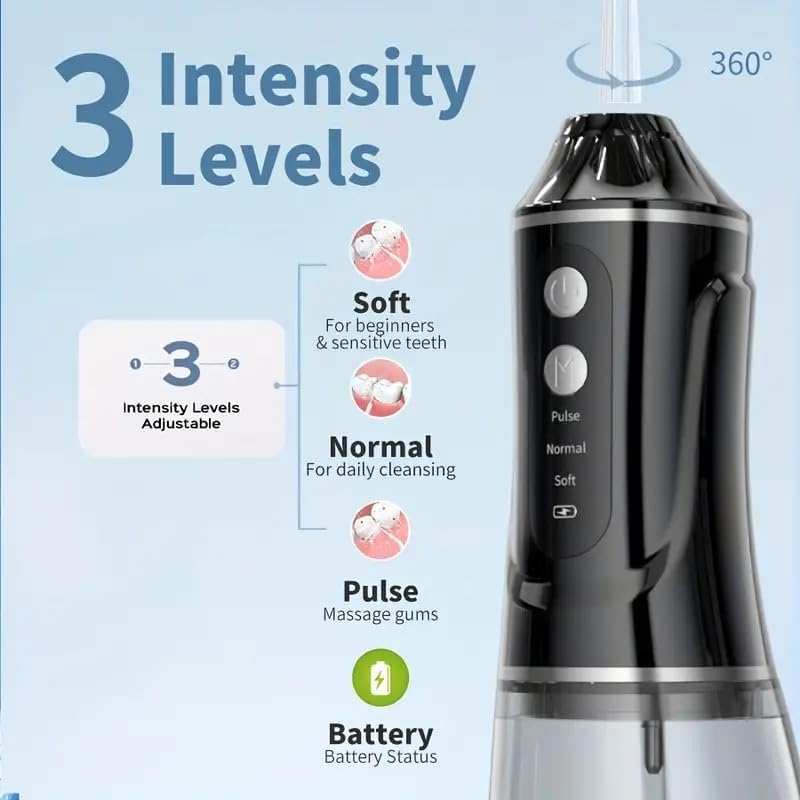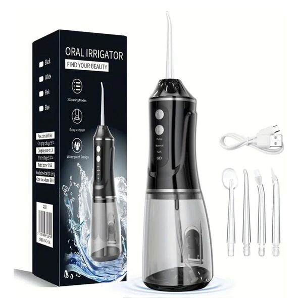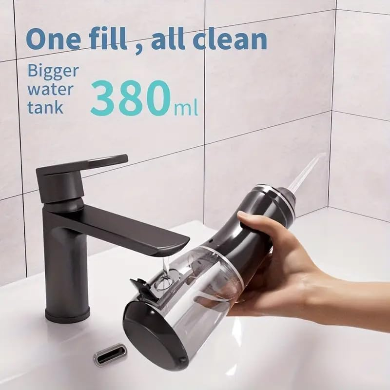 Επαναφορτιζόμενος στοματικός καθαριστής με δοχείο 380ml, 3 επίπεδα έντασης και 4 ακροφύσια για ολοκληρωμένη στοματική φροντίδα. Με Type-C φόρτιση και αδιάβροχη κατασκευή, αποτελεί πρακτική λύση για καθημερινό καθαρισμό δοντιών και ούλων στο σπίτι ή στο ταξίδι.