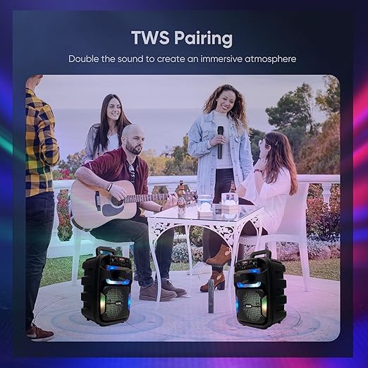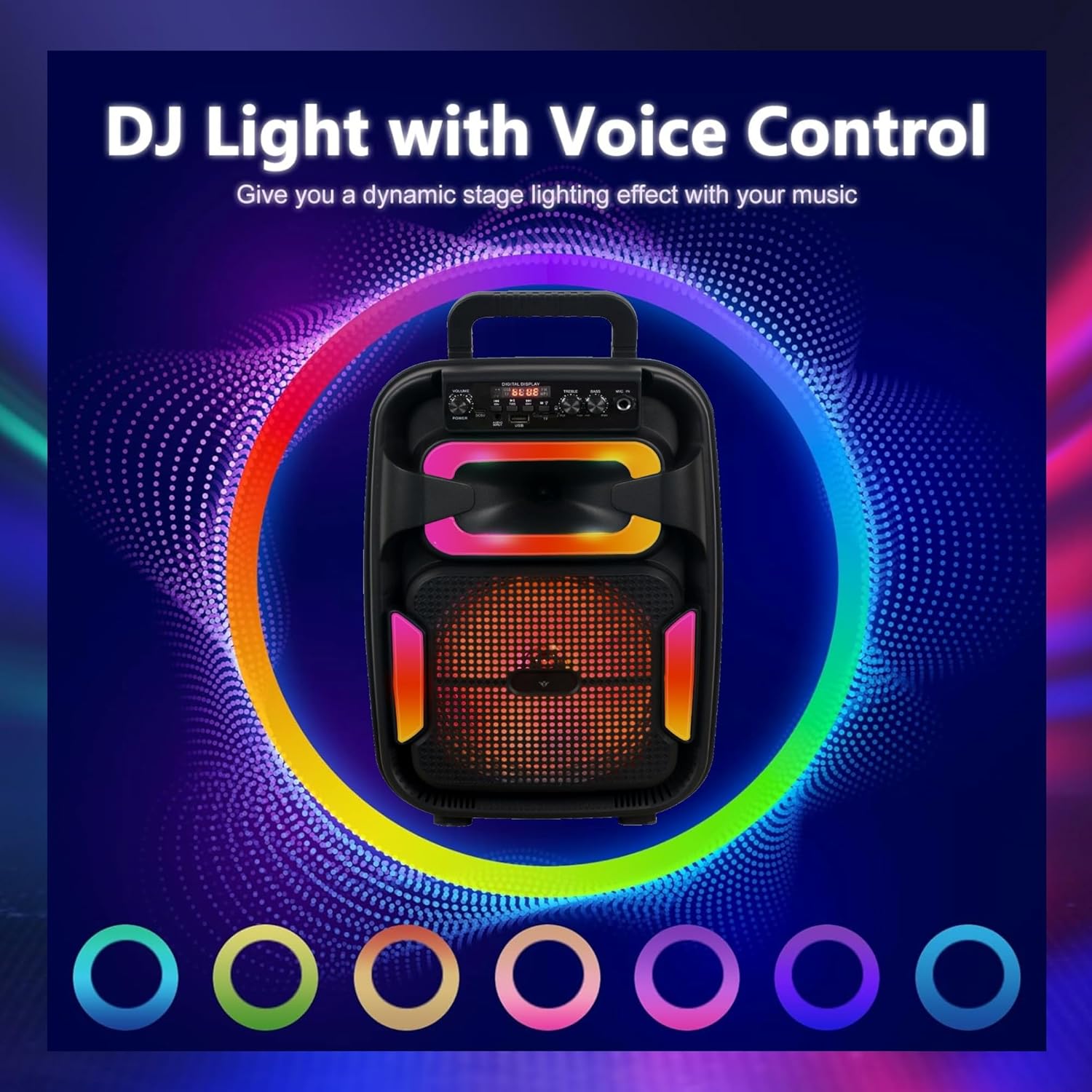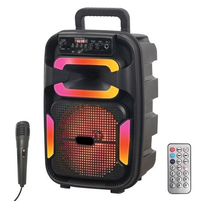 Φορητό ηχείο Bluetooth 8" με μικρόφωνο, ιδανικό για karaoke και πάρτι. Υποστηρίζει USB, TF και AUX, διαθέτει δυνατά μπάσα, LED φωτισμό και επαναφορτιζόμενη μπαταρία για εύκολη χρήση παντού.