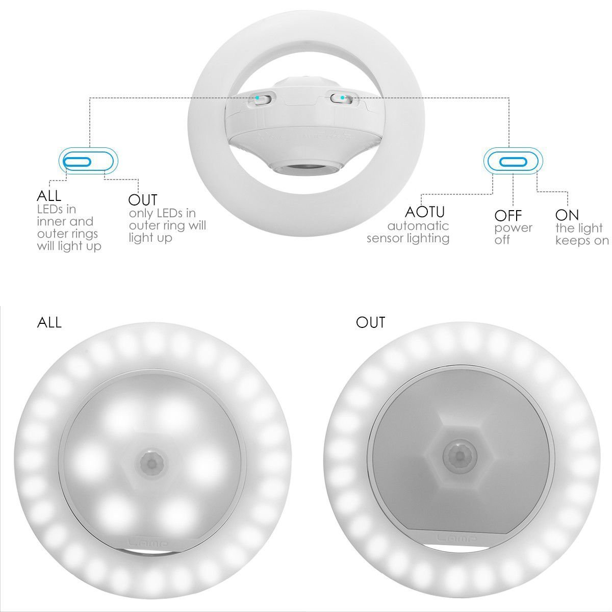 Διαθέτει λειτουργία του αισθητήρα κίνησης καθώς και λειτουργία που είναι μόνιμα αναμμένο. Μπορείτε να θέσετε σε λειτουργία μόνο τα LED που βρίσκονται περιμετρικά στον δίσκο ή όλα μαζί και τα κεντρικά LED.