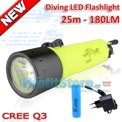 Αδιάβροχος φακός με Cree Led 180 Lumens για καταδύσεις, και άλλες χρήσεις εντός η εκτός νερού. Φωτίζει μέχρι τα 25 μέτρα και είναι αδιάβροχος στα 20 μέτρα.