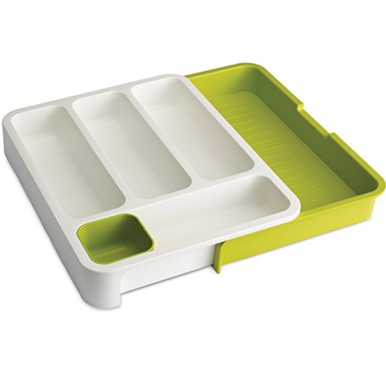 Αυτή η έξυπνη λύση αποθήκευσης διαθέτει τέσσερις θήκες που σας επιτρέπουν να διαχωρίζετε τα μαχαίρια, τα πιρούνια και τα κουτάλια σας, καθώς και μια περιοχή για μεγαλύτερα σκεύη ή μαχαίρια.