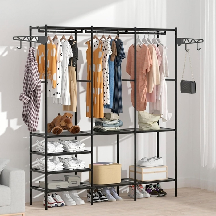 Με διαστάσεις 160 × 33 × 173 cm, προσφέρει άφθονο χώρο για ρούχα, παπούτσια, τσάντες και αξεσουάρ, ενώ οι πλαϊνές κρεμάστρες πολλαπλών θέσεων διευκολύνουν την οργάνωση καπέλων, παλτών ή τσαντών.