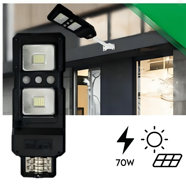 Το Ηλιακό LED Φωτιστικό Δρόμου 70W συγκεντρώνει και αποθηκεύει ηλιακή ενέργεια για τη λειτουργία του, ώστε να μη χρειάζεται να συνδεθεί σε παροχή ρεύματος.