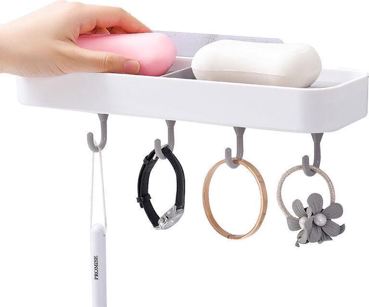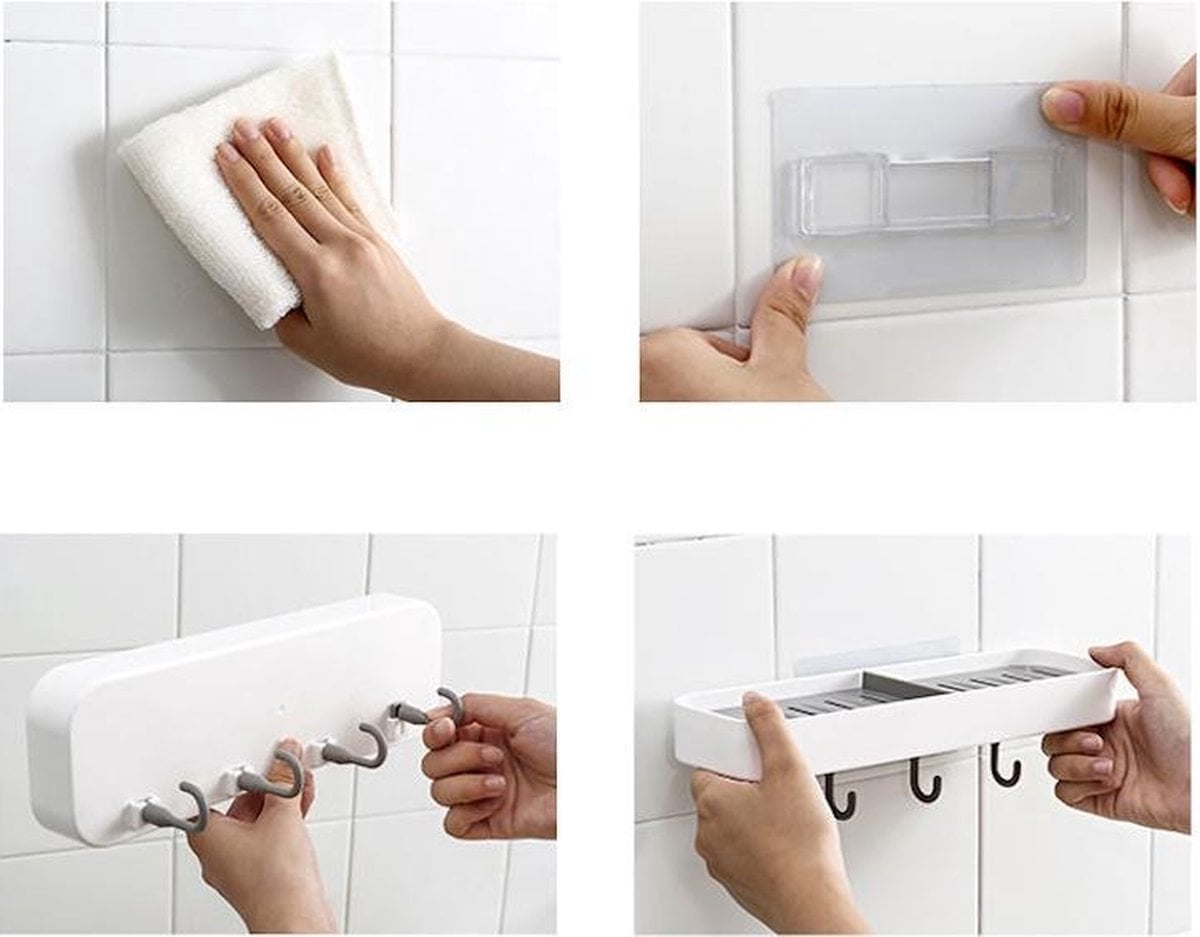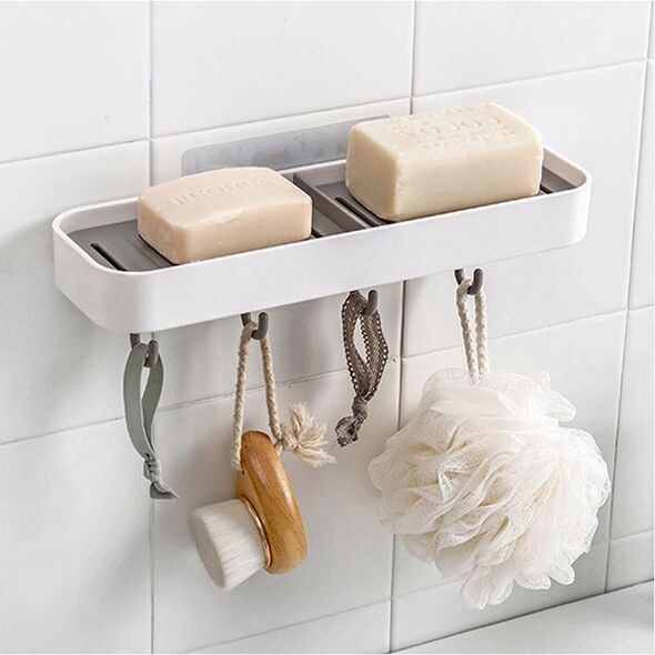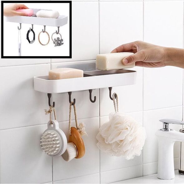 Επιτοίχιο Αυτοκόλλητο Ραφάκι για Σαπούνια Νιπτήρα Μπάνιου με 4 Γάντζους - Κρεμάστρες Πλαστικό