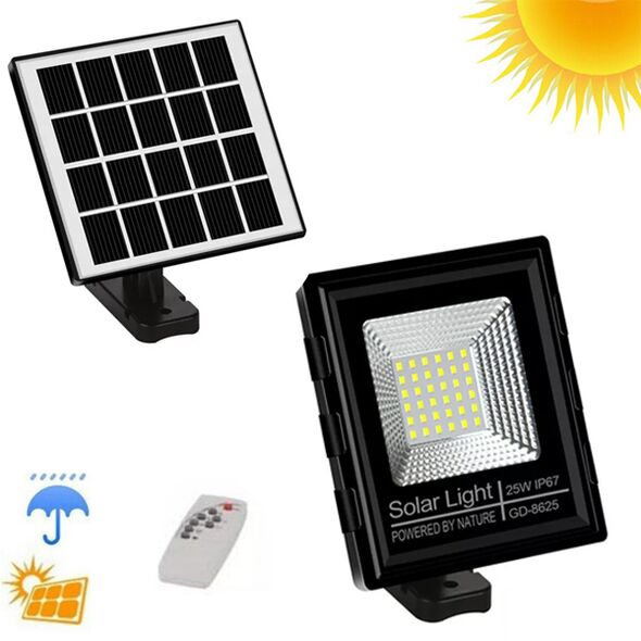 Ηλιακός προβολέας 25W με 36 LED που συγκεντρώνει και αποθηκεύει ηλιακή ενέργεια για τη λειτουργία του, ώστε να μη χρειάζεται να συνδεθεί σε παροχή ρεύματος.