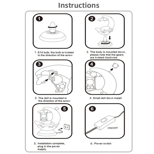 Ένα χαριτωμένο λαγουδάκι κάθεται σε μια κινούμενη κούνια που κρέμεται από μισό φεγγάρι. Σύννεφα με αστέρια βρίσκονται στη βάση του φωτιστικού. Το φωτιστικό αυτό θα βοηθήσει σίγουρα τη μικρή ή τον μικρό σας να κοιμηθεί.
