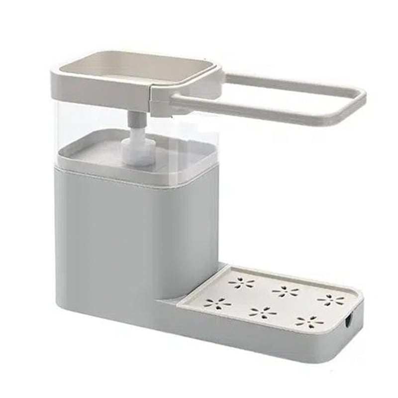 Αυτός ο διανομέας σαπουνιού προσφέρει μια πρακτική λύση για την αποθήκευση και τη χρήση σαπουνιού στην κουζίνα ή σε άλλους χώρους του σπιτιού. Με την ενσωματωμένη βάση για σφουγγάρι και πετσέτα, παρέχει εύκολη πρόσβαση σε αυτά τα αντικείμενα και τα κρατά οργανωμένα.