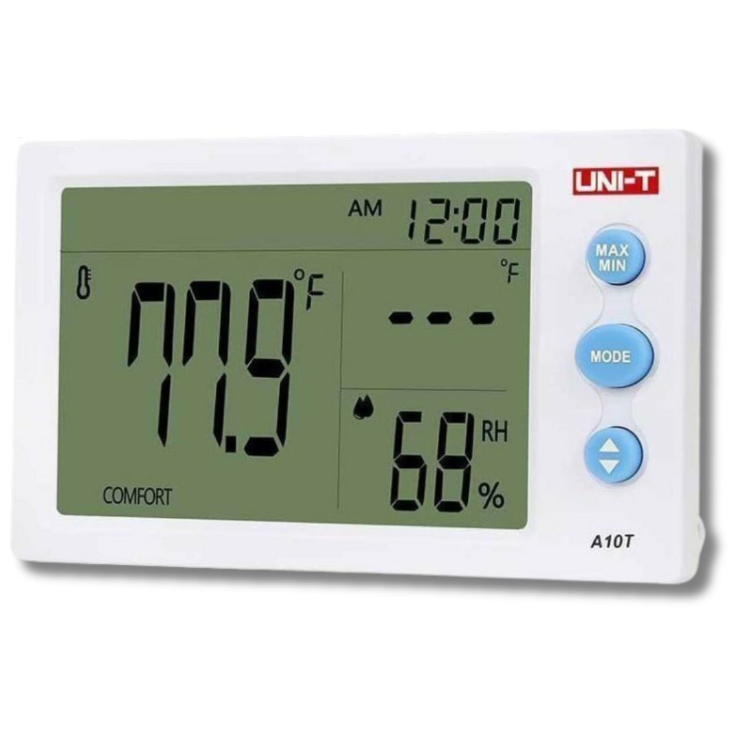 Ψηφιακός επιτραπέζιος μετρητής θερμοκρασίας και υγρασίας UNI-T A10T με LCD οθόνη 4,5”, ρολόι, ξυπνητήρι και ένδειξη μέγιστης/ελάχιστης τιμής. Ιδανικός για το σπίτι, το γραφείο και επαγγελματικούς χώρους.