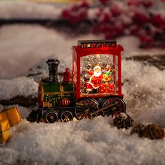 Χριστουγεννιάτικο φωτιζόμενο τρενάκι με Άγιο Βασίλη και δώρα. Διαθέτει LED φωτισμό και glitter εφέ που θυμίζει χιόνι. Σε κόκκινες και πράσινες αποχρώσεις με χρυσές λεπτομέρειες. Ιδανικό για δώρο ή γιορτινή διακόσμηση.