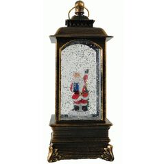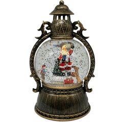 Φωτιζόμενο χριστουγεννιάτικο φανάρι-χιονόμπαλα 21 cm με Άγιο Βασίλη και glitter. Αντικέ μπρονζέ φινίρισμα, LED φωτισμός, λειτουργεί με μπαταρίες. Ιδανικό για γιορτινή διακόσμηση ή δώρο.
