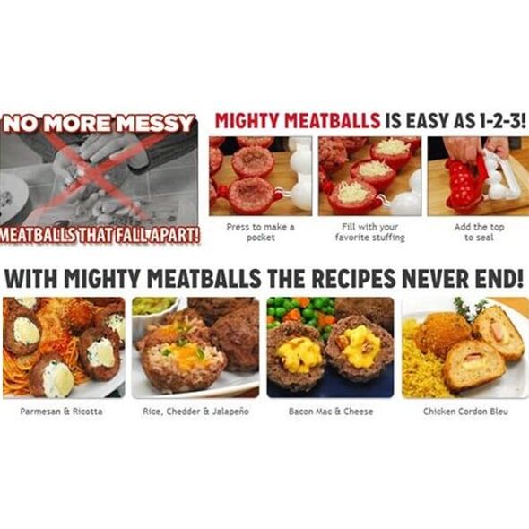 Με την συσκευή Mighty Meatballs μπορείτε να φτιάξετε εύκολα και γρήγορα τα αγαπημένα σας κεφτεδάκια με μία κίνηση. Η συσκευή είναι κατασκευασμένη από πλαστικό απαλλαγμένο από επιβλαβείς χημικές ουσίες. Με την συσκευή Mighty Meatball θα είστε σε θέση να φτιάξετε ή να γεμίσετε τα αγαπημένα σας κεφτεδάκια με αγαπημένα υλικά όπως λαχανικά, τυρί, σάλτσα ντομάτας κλπ.
