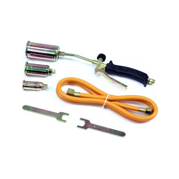 Είναι εξοπλισμένο με 3 ακροφύσια (διαμέτρου 25, 35 & 50 mm), εύκαμπτο σωλήνα 1.5 m, σκανδάλη, βαλβίδα ελέγχου ροής αερίου και 2 κλειδιά.