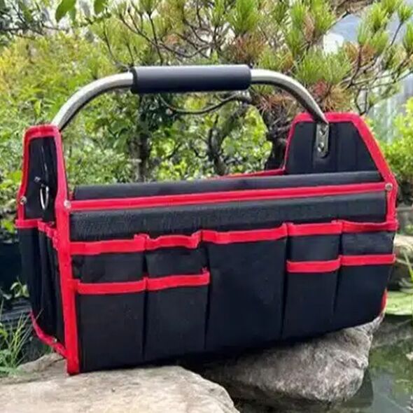Τσάντα εργαλείων ανοιχτού τύπου σε μαύρο χρώμα, κατασκευασμένη από ανθεκτικό πολυεστέρα και σχεδιασμένη για την αποθήκευση και τη μεταφορά εργαλείων.