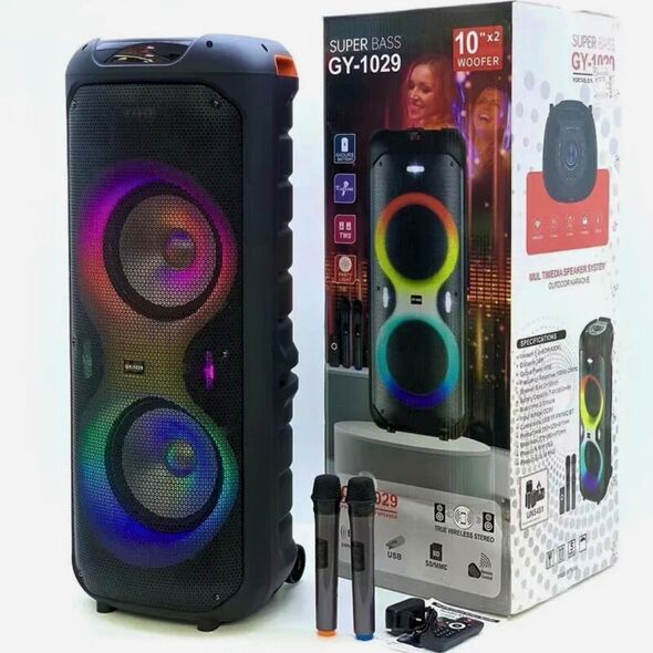 Ζήστε την απόλυτη εμπειρία διασκέδασης με το Φορητό Ηχείο Καραόκε 40W SuperBass, εξοπλισμένο με δύο μικρόφωνα, Bluetooth 5.1, FM ραδιόφωνο και εντυπωσιακό LED RGB φωτισμό που συγχρονίζεται με τη μουσική.