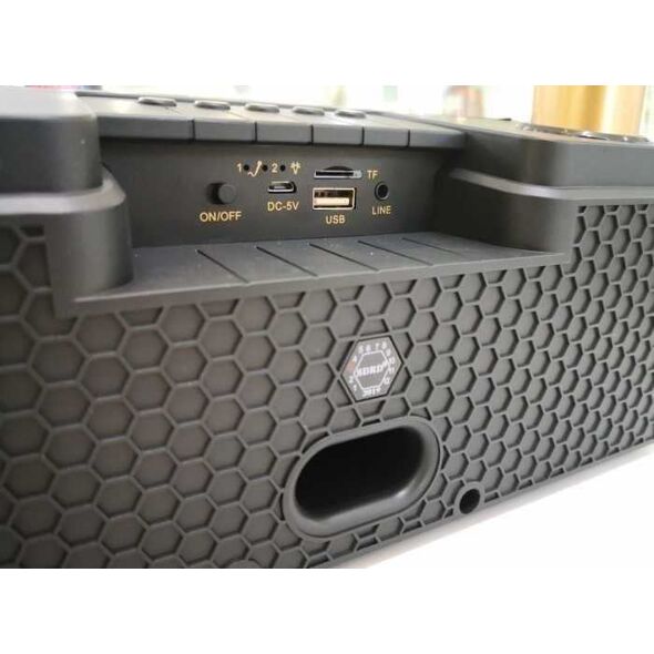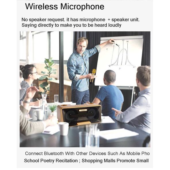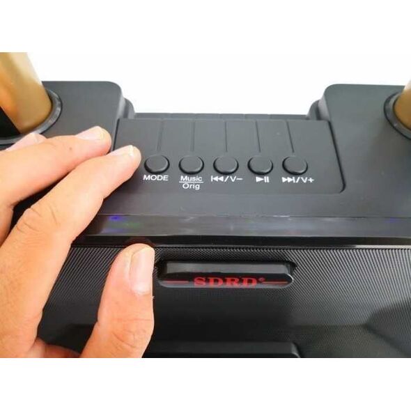 Λειτουργεί ως σύστημα ΚΑΡΑΟΚΕ κάνοντας μίξη κάθε πηγής ήχου ( SD card, USB, line in, bluetooth ) με τα 2 δυναμικά μικρόφωνα που περιλαμβάνει και αναπαράγει δυνατά και καθαρά μουσική και φωνητικά, ενώ διαθέτει και ειδική θέση για το κινητό σας στο μπροστινό μέρος.