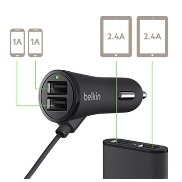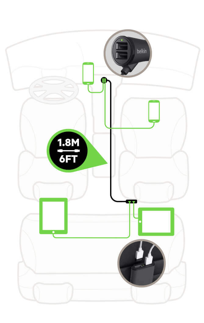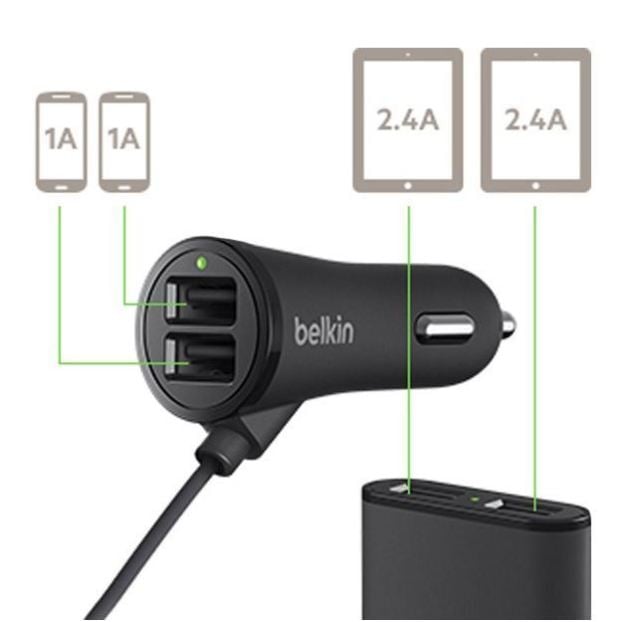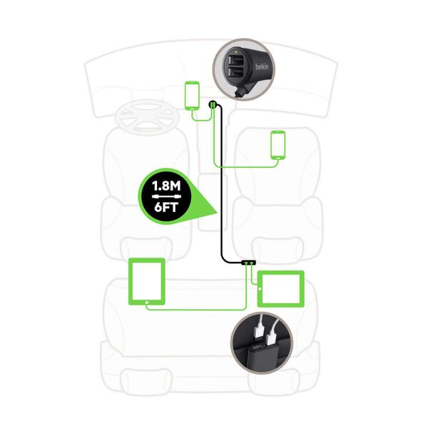Φορτιστής αυτοκινήτου Belkin για επιβατικά αυτοκίνητα με 4 θύρες extended USB. Παρέχει 2 θύρες φόρτισης για τον οδηγό και τον συνοδηγό στον αντάπτορα για τον αναπτήρα και 2 θύρες USB στον αντάπτορα στο καλώδιο επέκτασης για τους επιβάτες στα πίσω καθίσματα.