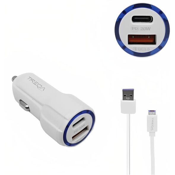Φορτιστής Αυτοκινήτου Ταχείας Φόρτισης 12V – 24V με Θύρα USB-A 3.1Α και Θύρα USB-C PD 20W και Καλώδιο Micro USB - Treqa - Λευκό