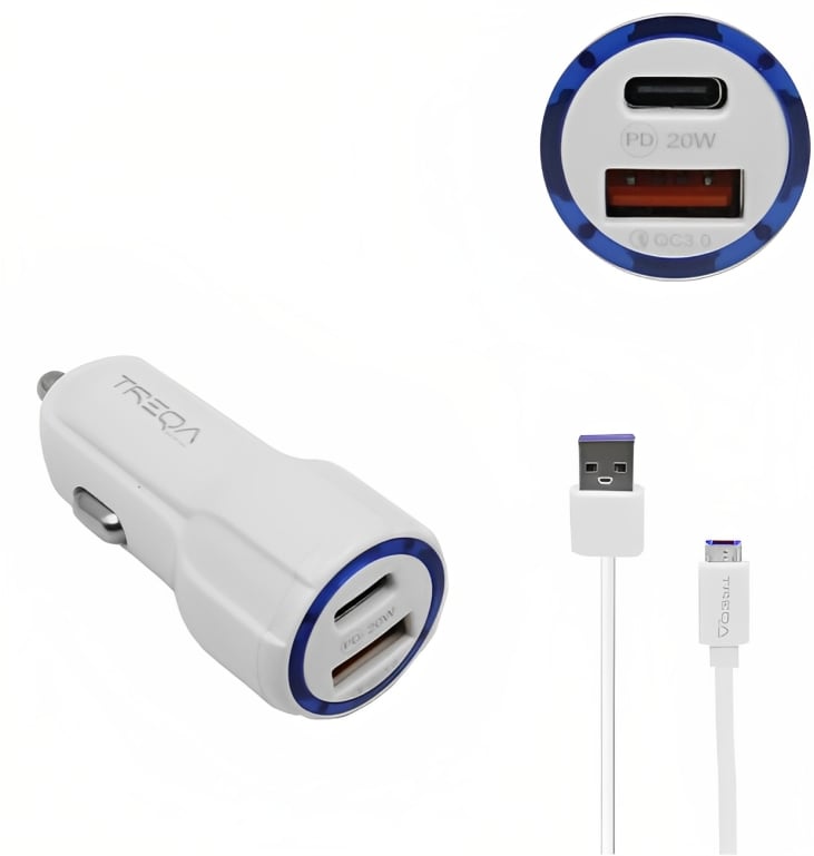 Φορτιστής Αυτοκινήτου Ταχείας Φόρτισης 12V – 24V με Θύρα USB-A 3.1Α και Θύρα USB-C PD 20W και Καλώδιο Micro USB - Treqa - Λευκό