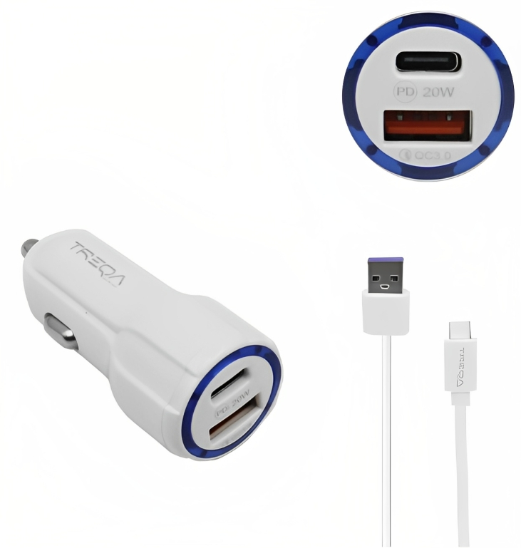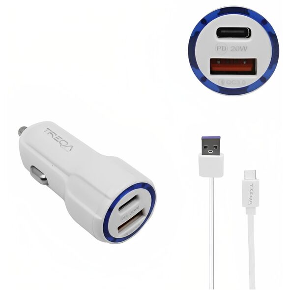 Φορτιστής Αυτοκινήτου Ταχείας Φόρτισης 12V – 24V με Θύρα USB-A 3.1Α και Θύρα USB-C PD 20W και Καλώδιο TypeC - Treqa - Λευκό
