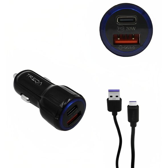 Φορτιστής Αυτοκινήτου Ταχείας Φόρτισης 12V – 24V με Θύρα USB-A 3.1Α και Θύρα USB-C PD 20W και Καλώδιο TypeC - Treqa