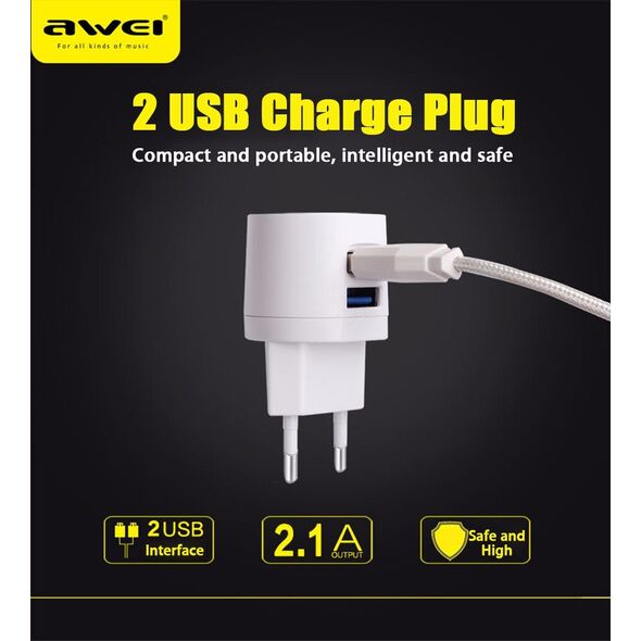 Φορτιστής Ρεύματος Fast Charge με δύο Θύρες USB και Καλώδιο Micro USB - 2x USB Charger 2,1A Awei C900