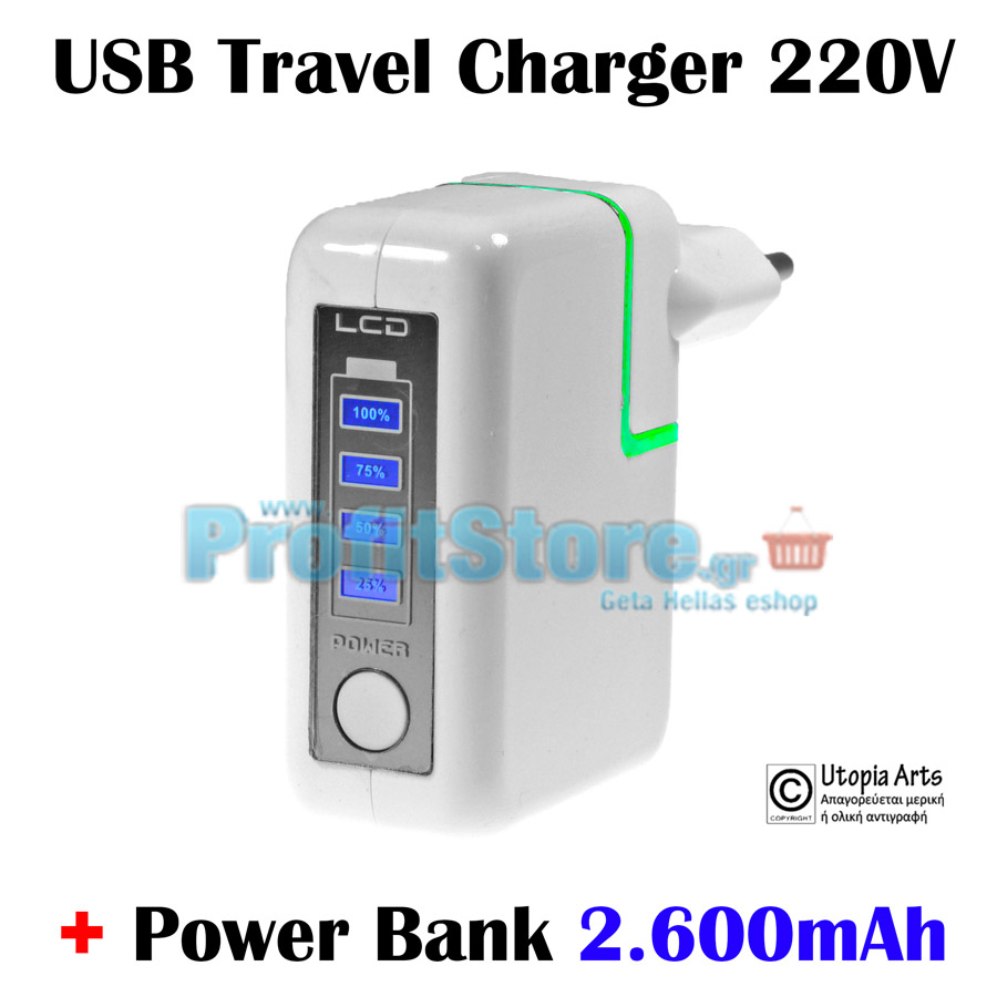 Μικρός φορτιστής ρεύματος μπαταρίας με έξοδο USB 2.1Α. Συνδέεται στο δίκτυο ρεύματος 220V όπως κάθε συνηθισμένος φορτιστής ρεύματος άλλα ταυτόχρονα ενσωματώνει και μπαταρία λιθίου 2.600mAh* η οποία αποθηκεύει ενέργεια για να φορτίσει τις συσκευές σας όταν βρίσκεστε μακρυά από πρίζα και ρεύμα...